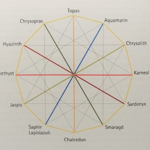 Smaragd, Chalcedon, Saphir, Lapislazuli, Jaspis, Amethyst, Hyazinth/Zirkon und